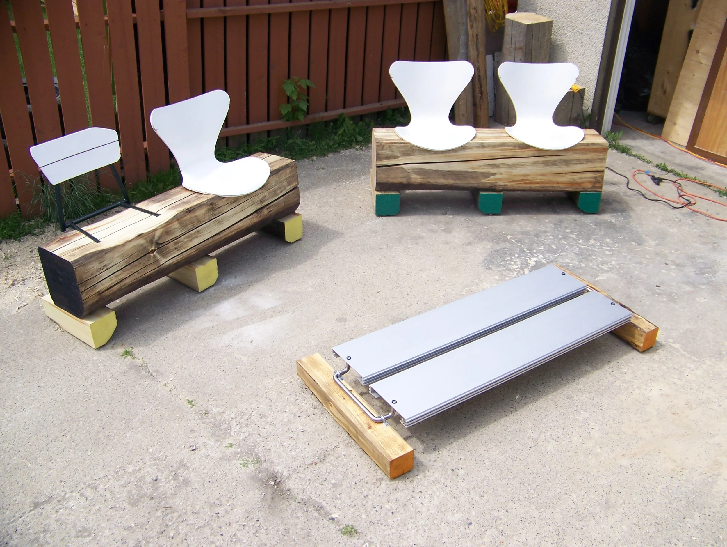 Up-cycled stage furniture for talk-show portion of the award ceremony. We had 3 Fritz Hansen (Arne Jacobsen Series 7) chairs given us by a friend and found a poplar timber to compliment them, along with some extruded aluminum and stainless steel door handles that came together very nicely for a table.